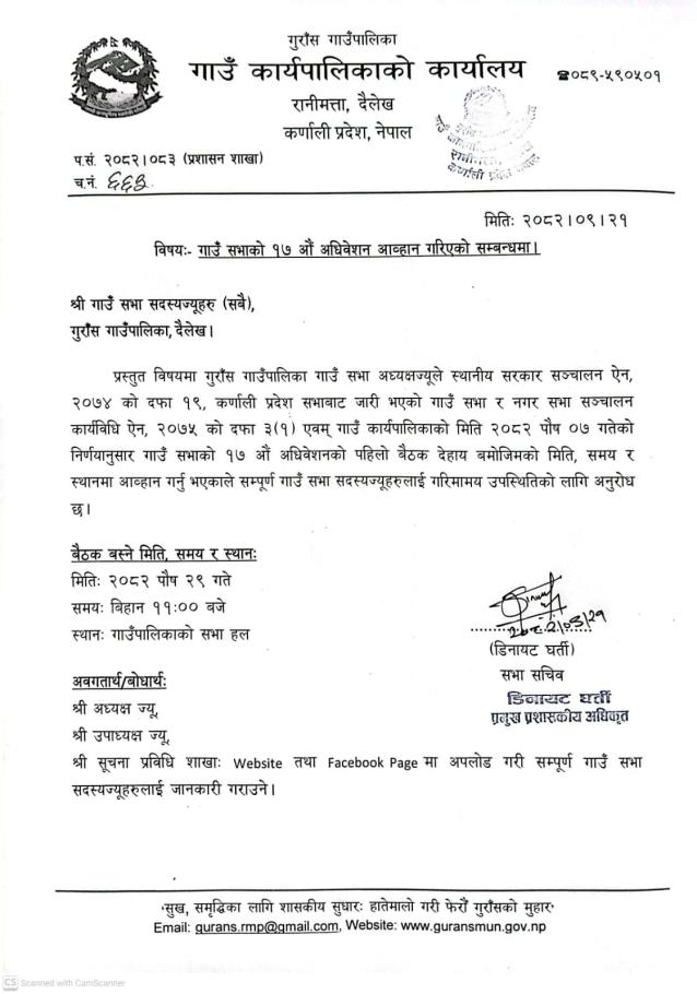 गाउँसभाको १७ औँ अधिवेशन आव्हान गरिएको सम्बन्धमा ।
