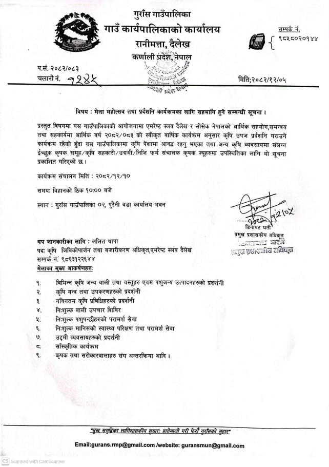 मेला महोत्सव तथा प्रदर्शनी कार्यक्रममका लागि सहभागि हुने सम्बन्धी सूचना।