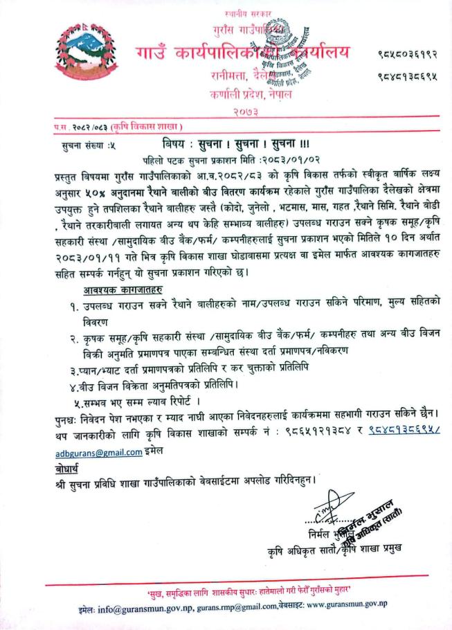 रैथाने बालीको बीउ उपलब्ध गराउन सक्ने फर्म/कम्पनी/बीउ बैंक/सहकारी/समुह लाई सुचना