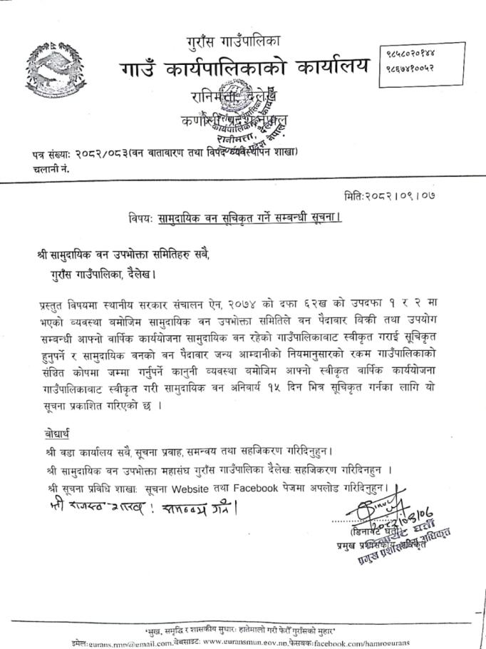सामुदायिक वन सुचिकृत गर्ने सम्वन्धी सूचना ।