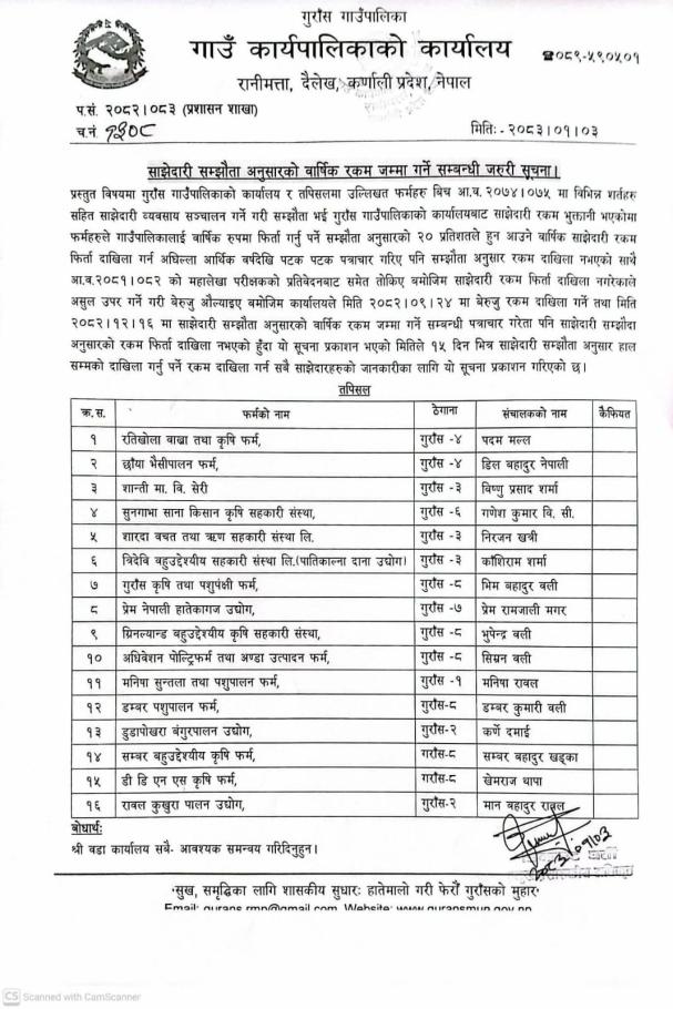 साझेदारि सम्झौता अनुसारको वार्षिक रकम जम्मा गर्ने सम्बन्धी सूचना ।